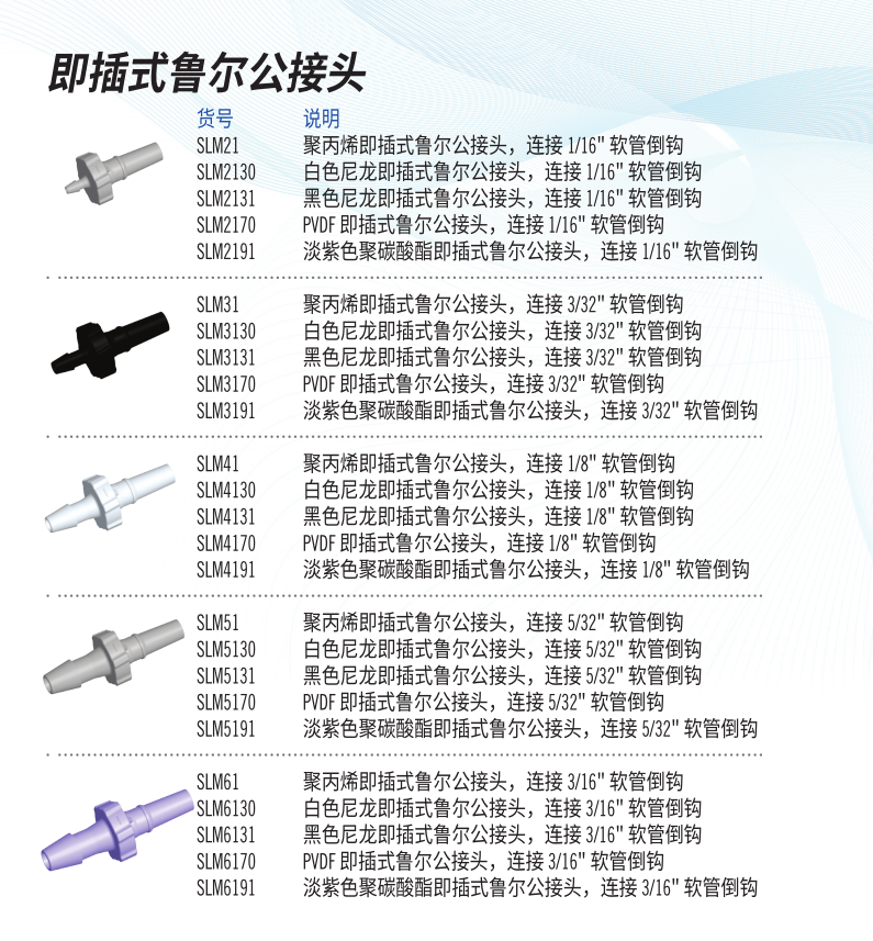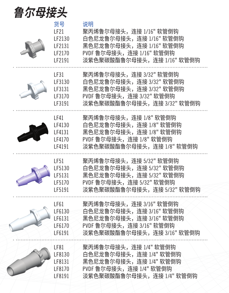 Luer Connectors are a common choice for limited use or disposable applications where a shutoff valve is not required. Fittings Express luer fittings are suitable for small flow applications, typically less than 1/4", and feature parting line-free hose barbs. They mate with luers manufactured to ISO Standards 594-1 and 594-2 and are the preferred choice when looking for high quality, precision molded fluid components.